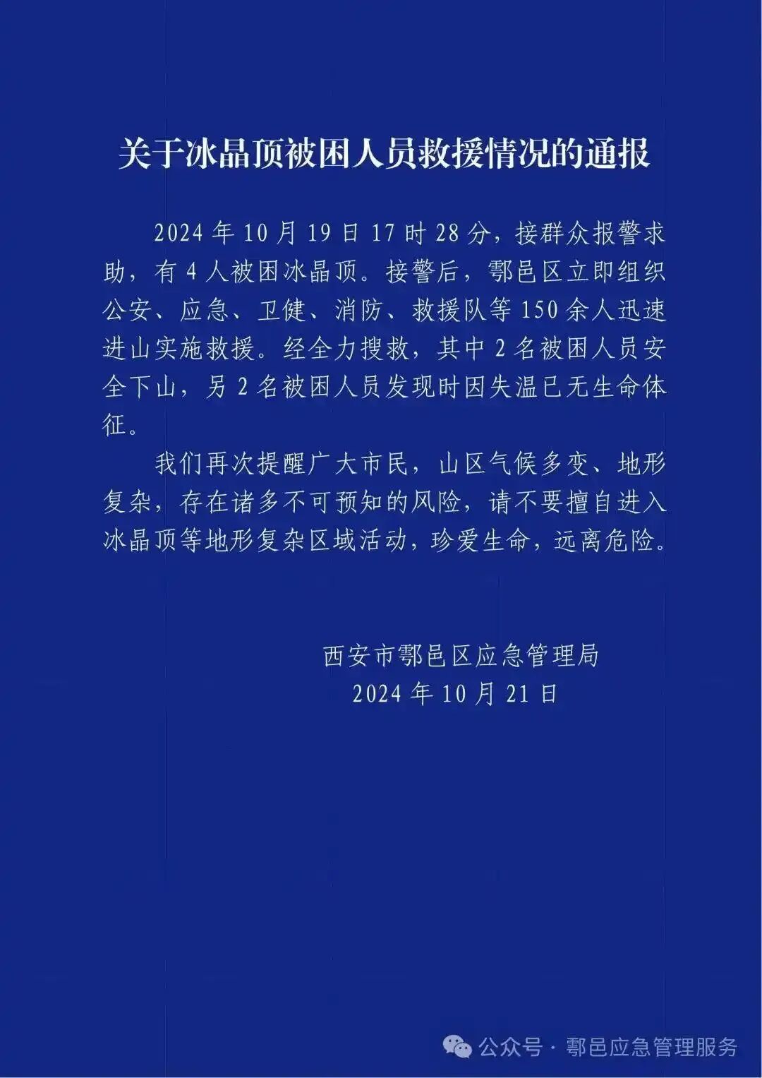 10月21日,西安市鄠邑区应急管理局通报,2024年10月19日17时28分,接群众报警求助,有4人被困冰晶顶。接警后,鄠邑区立即组织公安、应急、卫健、消防、救援队等150余人迅速进山实施救援。经全力搜救,其中2名被困人员安全下山,另2名被困人员在救援人员发现时因失温已无生命体征。