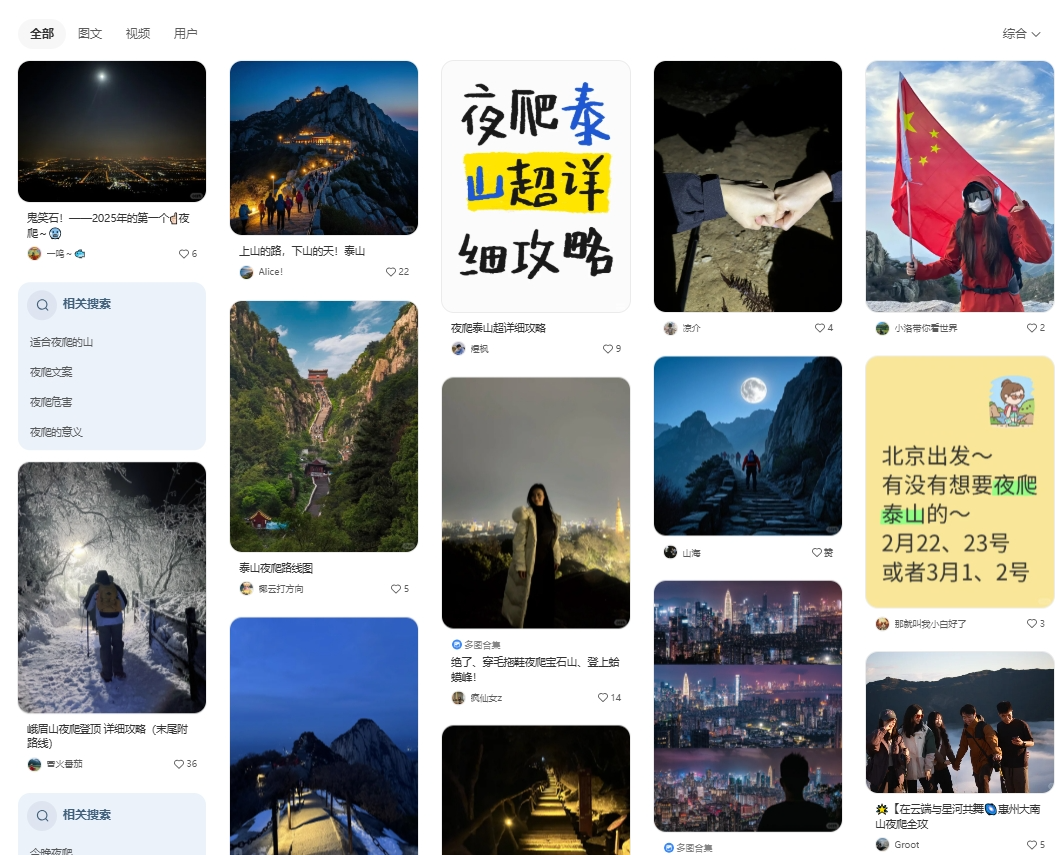 某社交平台,输入“夜爬”,跳出多条相关笔记 图源:网络截图