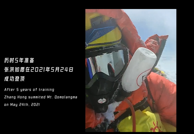 《看不见的顶峰》记录了张洪攀登珠峰的整个过程,在冲刺阶段,电影屏幕黑了下来,只剩张洪的声音。这不是导演的艺术处理,而是真实情况。原来当时在到达登希拉里台阶前,几个团队成员的氧气阀出了问题。为了安全起见,张洪和三名向导继续冲顶,其他人则选择下撤,其中就包括摄影师。最后的冲刺,所有观众都看不到画面,恰如置身张洪的黑暗世界,可以闭上眼跟随他去体会最后的冲刺。“最后的冲刺阶段,每走一步都非常艰难了,”张洪说,“实在走不动的时候,我就会用左手来摸右臂上的五星红旗,心里面就有点动力,促使我继续向前走。然后一边走,一边调整呼吸,不断进行深呼吸。我还不断地和山体交流、和风交流。”甚至有几次,他不想再爬了,不过一想到妻子和孩子就又有了斗志。过去的点点滴滴,既是苦难,又是动力。当年刚去上海打拼,张洪和夏琼在沪太路租了一间又小又破的房子。由于离上班的地方远,夏琼隔几天才回次家。当时,她上班的店里提供早餐,每天发一个煮鸡蛋。夏琼主动提出要生鸡蛋,她会攒起来带回家给张洪吃。有一回,夏琼回家后,张洪觉察到她情绪不对。听到她往盆里倒东西,张洪本想走过去问问出了什么事,却不小心把盆碰翻了。夏琼哇地一下哭出了声。张洪蹲在地上一阵摸,才知道洒的全是鸡蛋。原来,夏琼攒了一周的鸡蛋坐地铁的时候都被挤破了。她本想着起码还能给张洪做个鸡蛋汤,结果又被碰翻在地。听到这些后,张洪心如刀割,满怀愧疚,“我开始问我自己,张洪,你还是个男人吗?你本该为她遮风挡雨,现在反而成为她的累赘。”张洪的内心一直有种无形的压力。直到成功登顶珠峰,才终于得到期待已久的释放。