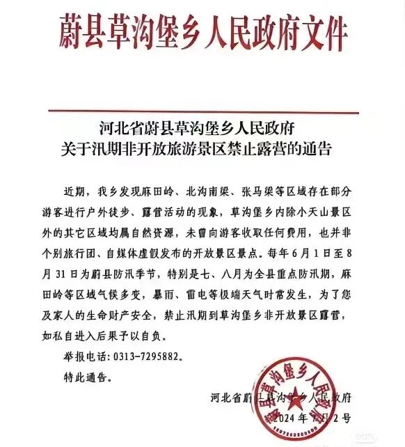 7月2日,蔚县草沟堡乡人民政府也发布汛期非开放旅游景区禁止露营的通告,提醒广大游客注意安全,如私自进入,后果自负。