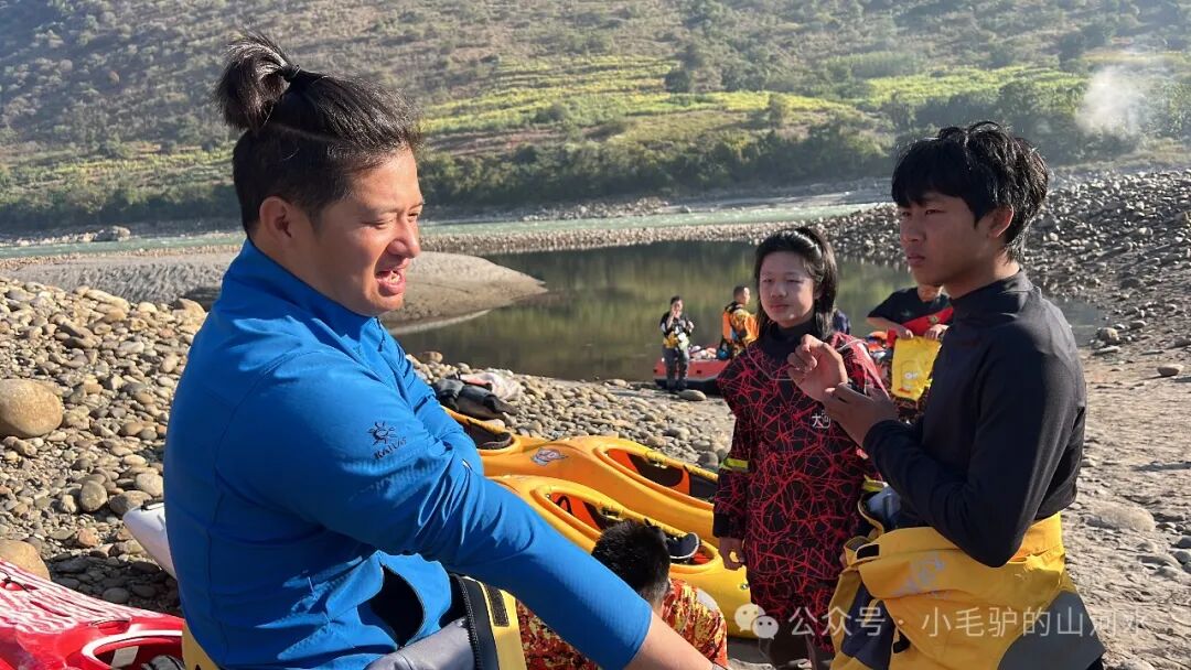 珠江之友何小军校长(风衣)给皮艇队员(干衣)调整头盔