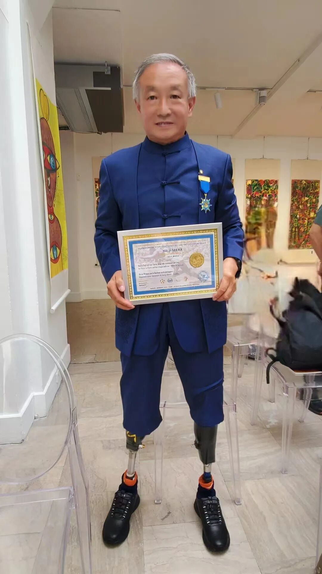 夏伯渝在活动现场展示勋章和证书