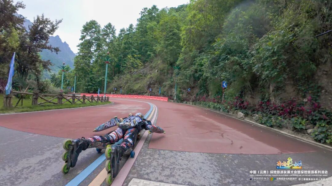 世界“轮滑超人”布朗杜在福贡县老姆登表演高山公路轮滑速降