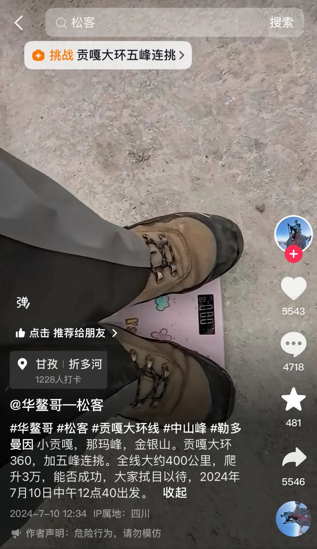 今年年初,24岁的松客,仅用25天,就完成了从华山到鳌山鳌头的600公里徒步穿越。这一成就,不仅为他赢得“华鳌穿越第一人”的美誉,也让他在户外圈中小有名气。然而,荣耀背后也伴随争议。他曾因违规攀登四姑娘山被终身禁入,但却并未阻止他继续“探险”的脚步。7月10日,松客宣布开始独自徒步贡嘎大环线,全程360公里,其中包括连续攀登中山峰、勒多曼因、小贡嘎等3座海拔超过5000米和2座超过6000米的雪山,预计用时20天。这一充满挑战的计划,立即吸引了众多户外爱好者的关注。然而,命运似乎与松客开了一个残酷的玩笑。截至7月24日,独步贡嘎之行的松克,仍未能与外界取得联系。不少网友在网上发帖:“户外强驴松客失联了?”“松客大神疑似在贡嘎失联14天。”网络上,关于松客失联的消息在不断发酵。