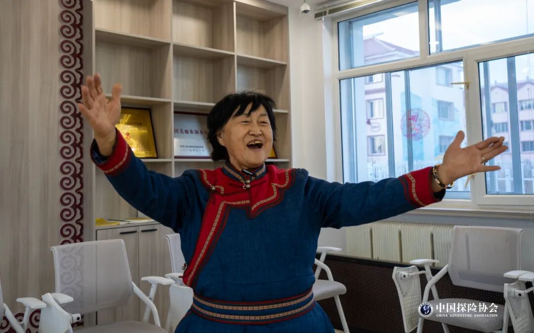 国家级鄂伦春民歌非物质文化遗产传承人、鄂伦春萨满文化唯一传承人关金芳正在演唱
