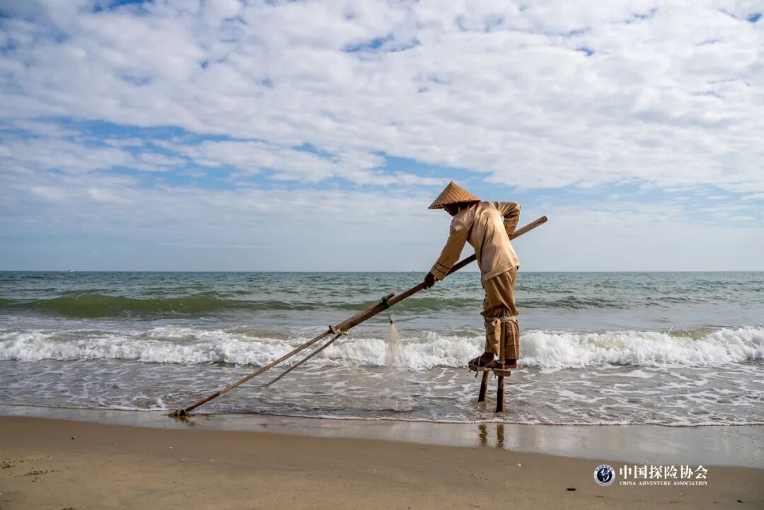 脚踩高跷,手持大网,在海洋中推浪前行——这种类似于杂技表演的捕鱼方式,被称为高脚罾。其中,“高脚” 指的是渔民踩着高跷捕鱼;“罾” 是渔网,用作动词即表示用渔网捕捞。这种高跷捕鱼方式已延续五百多年。在古代,京族渔民为了生计,凭借智慧和勇气创造出了这种独特的捕鱼方法。据了解,每年农历6月至9月,随着南风到来,一种叫 “南虾” 的小体型虾会从深海回游到浅海的万尾岛沿岸。它们通常在距海面1米左右深的地方活动,而这个高度,对于渔民来说,捕捞存在一定难度——站在海水里,难以看清海里虾群的走向。于是,京族人想出了踩高跷的办法:增加脚的高度,在海水中居高临下地一边观察、一边捕捞,可以捕到更多的鱼虾。京族非遗文化传承人阮志成说:“因为这个虾是根据我们这边的海水去流动——假如这个水要从这边流,你就要逆着推。另外因为捕虾要看天气,夏天时候多一些,秋冬天的时候就少。”阮志成一边给天璇队员们演示,一边解释道:“这样10分钟左右就到网了,一网可以达到100斤。这个网抬起来之后,要往前抬。我们男人一般就在这里捞,女人在岸上帮你把捞上来的虾、箩筐都抬上去晒干。所以,我们男人干活,女人就在那个沙滩等候,有打到足够多的虾就叫她。”看似容易,但其实渔民高跷捕鱼是一项强体力活儿,对力量和平衡都有很高要求。捕捞时踩在高跷上,肩扛着重重的罾下海,行走时驳脚会陷进沙里,要拔上来再迈步,还要在海水里面推罾、起罾、收罾、捡虾、抖罾等。当地人说:一个真正的好渔民必须做到脚下站得稳、手上力气沉。可就是这样一项承载着京族文化与传统的捕鱼方式,如今却面临严峻挑战。随着时代发展,社会、经济发生较大变化,越来越多的年轻人选择外出务工,使他们与家乡的传统捕鱼生活逐渐脱节。而高跷捕鱼这种需要长期练习和经验积累的技艺,在年轻人中的传承出现了断层。没有了年轻一代的参与和传承,京族文化面临前所未有的挑战。阮志成回忆道:“我记得那时候我是11岁,应该是五年级,我学的时候一般是周末,爷爷中午放牛回来后开始教我们。我那个时候,也跌倒了很多次,也不想练习了,然后爷爷一直都鼓励我,说一定要把我们祖传的这个捕捞的工具传下去——因为之前老一辈的很多都走不动了。”当下,非物质文化遗产的保护与传承已成为时代赋予的新使命。京族人民也在积极探索传统文化的现代化表达方式,希望通过文化旅游、进校园等手段,让更多人了解和参与到京族文化的保护与传承中来。阮志成感慨地说:“这个肯定不能丢的。现在国家也很重视我们少数民族这个项目,还有很多非遗文化,我们一定要把它传承下去。之前(高跷)捕鱼都是为了生计,现在这种高跷已经走向舞台了,就像去台湾省,还有我们中央民族大学,都走进校园了。所以,一定要把这个文化保留下来、传承下去。”“这一刻,我仿佛能听到大海的心跳,感受到京族渔民对这片蔚蓝海洋的依恋与敬畏。在这片古老而又充满活力的土地上,京族人以他们独有的方式,续写着与大海的不解情缘,让每一个到访者都能在这片金色沙滩上,找到心灵的归宿。”中国探险协会会员、天璇队领队王晓英说。特别鸣谢