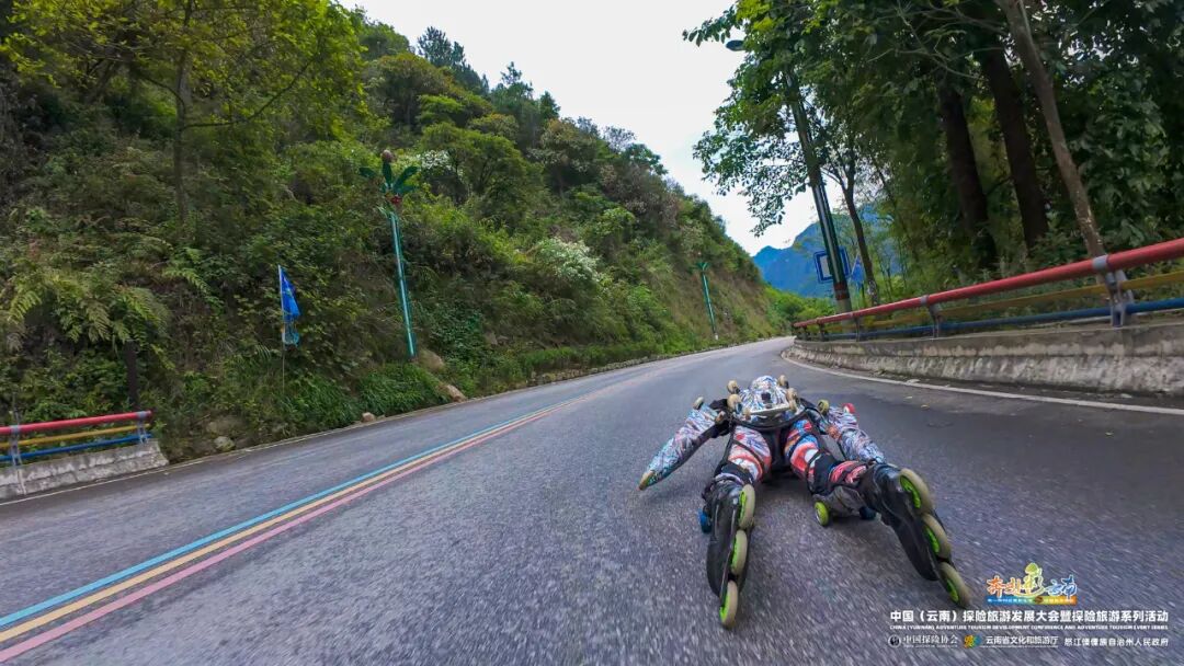 世界“轮滑超人”让伊夫·布朗杜表演高山公路轮滑速降