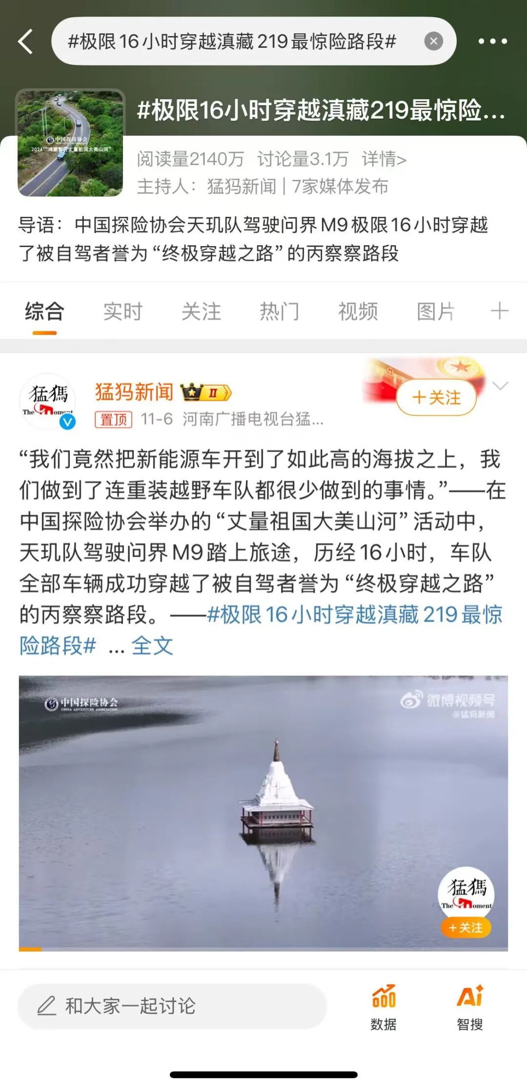 话题“极限16小时穿越滇藏219最惊险路段”在微博的浏览数据