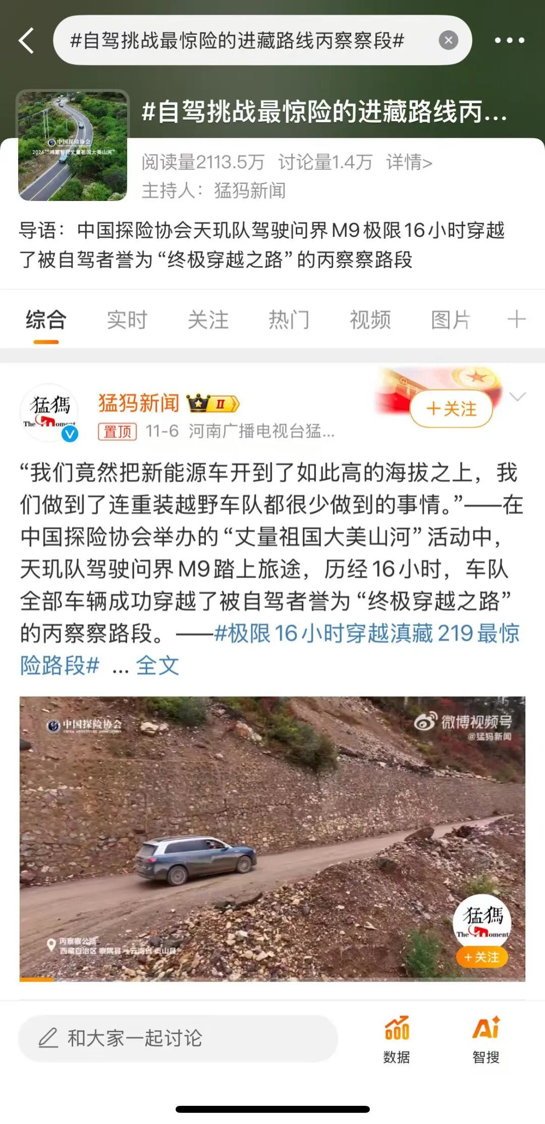 话题“自驾挑战最惊险的进藏路线丙察察段”在微博的浏览数据