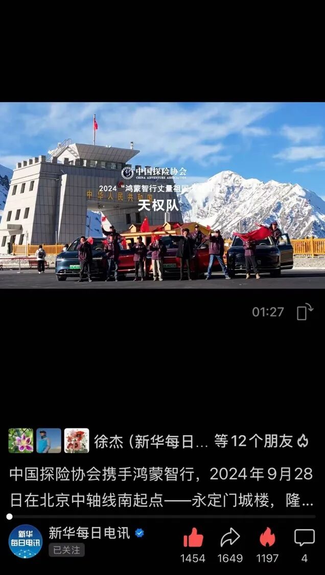 2024年国庆节前夕,为向共和国75周年华诞献礼,中国探险协会联合鸿蒙智行,发起“鸿蒙智行丈量祖国大美山河”环国境线探险活动,经过7支队伍、18天、全程3.2万公里精彩行程,最终取得圆满成功。本次活动的7支队伍,以北斗七星天枢(北京-深圳)、天璇(深圳-腾冲)、天玑(拉萨-腾冲)、天权(拉萨-喀什)、玉衡(喀什-哈密)、开阳(哈密-抚远)、摇光(抚远-北京)命名,从各自起点出发,按顺时针方向,首尾相接,历时18天,途经天津、山东、江苏、上海、浙江、福建、广东、广西、云南、西藏、新疆、内蒙古、黑龙江、吉林、辽宁、河北等17个省(直辖市、自治区),以及东兴、友谊关、打洛、畹町、姐告、片马、吉隆、普兰、红其拉甫、阿拉山口、吉木乃、策克、乌力吉、满都拉、甘其毛都、二连浩特、珠恩嘎达布其、阿尔山、额布都格、满洲里、黑山头、室韦、呼玛、黑河、嘉荫、同江、抚远、密山、绥芬河、珲春、圈河、图们、长白、集安、鸭绿江等边境重要节点,在黑龙江抚远的东极广场、广东湛江徐闻的南极村、黑龙江漠河的北极村分别打卡中国大陆三极,造访“西北之北”——位于新疆喀纳斯的新疆生产建设兵团第十师185团所在地,全程3.2万余公里,共同丈量祖国大美山河,完成陆地边境线闭环。