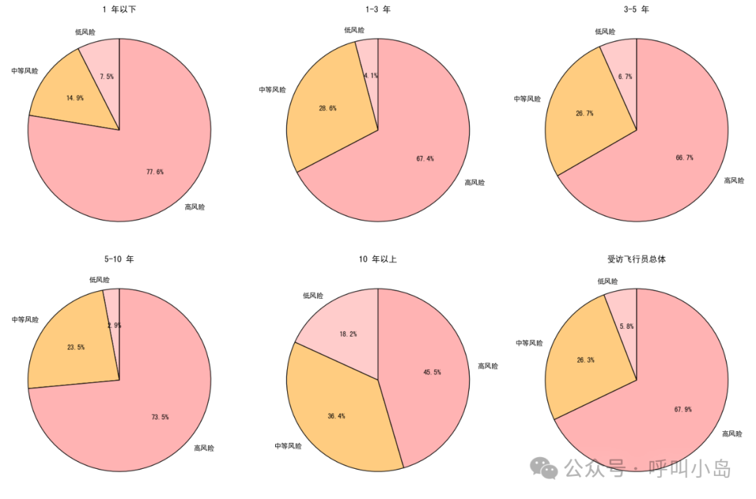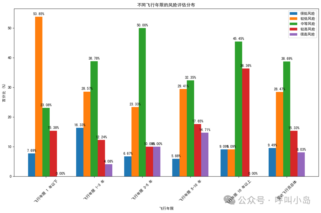 结论: 大多数飞行员都认为他人违反规则的风险较高。随着飞行年限的增加,认为高风险的比例有一定波动,但总体仍处于较高水平。