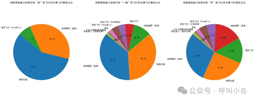 自评为“差”的飞行员更倾向于保守,飞行类型较为单一,对野飞的接受程度较低,且遇到危险情况和经历或目睹严重事故的比例也较低。这可能表明,他们确实采取了更谨慎的飞行行为。