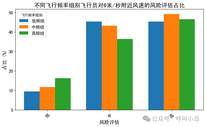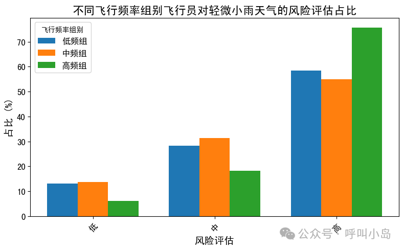 结论: 不同训练频率的飞行员对6米/秒附近风速的风险评估都偏向中高风险,且认知程度较为一致。随着训练频率的增加,飞行员对低风险的认知有所增加。不同飞行频率组别飞行员对阴云覆盖天气的风险评估占比结论: 不同训练频率的飞行员对阴云覆盖天气的风险评估认知存在差异。低频训练的飞行员认为中等风险的比例最高。而中频训练的飞行员倾向于认为高风险的比例最高,高频训练的飞行员认为中等风险的比例最高。不同飞行频率组别飞行员对轻微小雨天气的风险评估占比